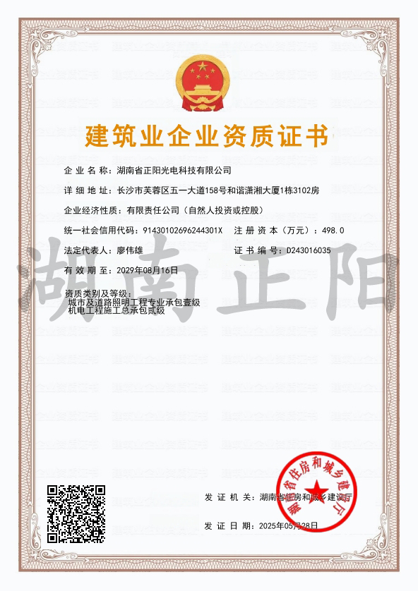 湖南省正陽光電科技有限公司是一家從事亮化工程及大型燈光藝術(shù)的設(shè)計(jì)、制作、安裝和維護(hù)于一體的專業(yè)化公司。公司資質(zhì)齊全、管理嚴(yán)謹(jǐn)、技術(shù)先進(jìn)、實(shí)力雄厚,取得了城市及道路照明工程專業(yè)承包壹級(jí)資質(zhì)、照明工程設(shè)計(jì)專項(xiàng)甲級(jí)資質(zhì)、機(jī)電工程施工總承包貳級(jí)資質(zhì)、施工勞務(wù)等資質(zhì)、國家高新技術(shù)企業(yè)、國家“重質(zhì)量·守誠信”示范企業(yè)。
